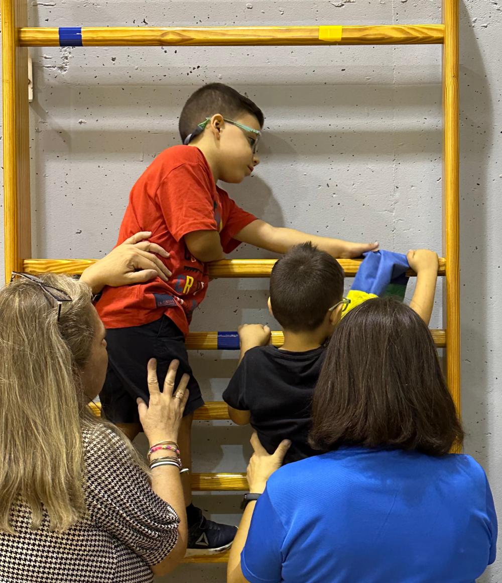 Dos alumnos escalan por unas espaldares bajo el atento cuidado de sus educadoras