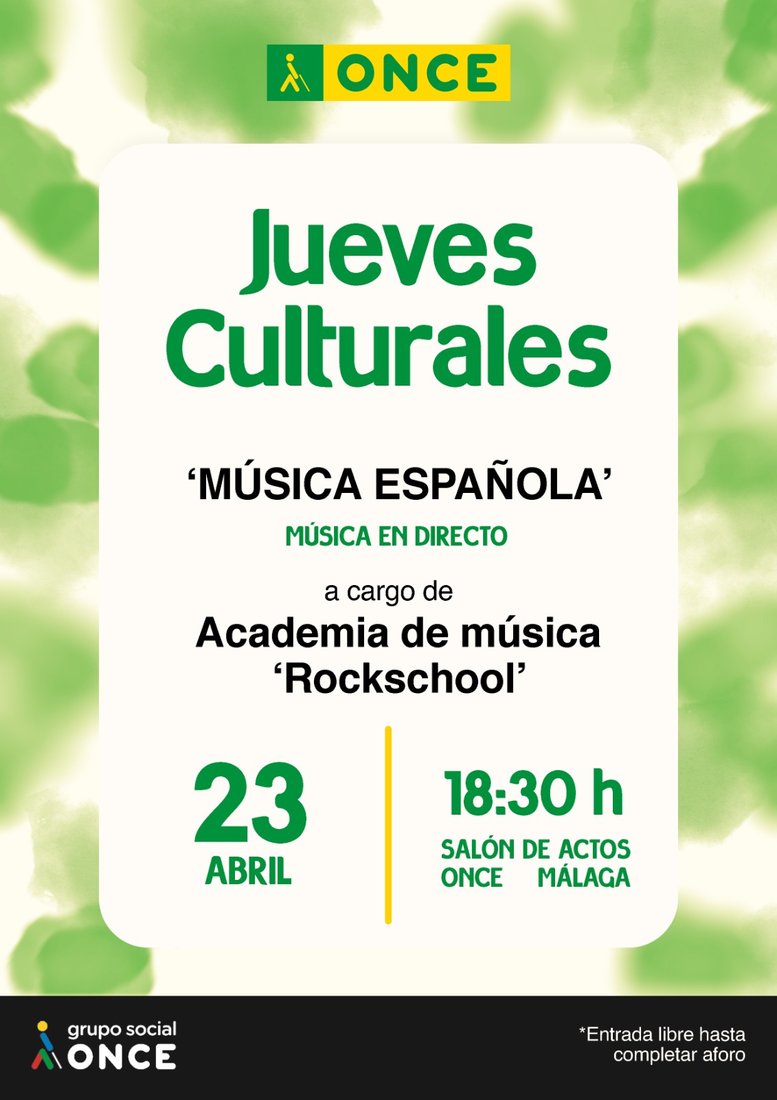 La academia de música 'Rockschool' llega a los Jueves culturales para deleitar al público de la ONCE de Málaga con música en directo, esta vez entonando un popurrí de canciones españolas. Será como siempre, a partir de las 18:30 en nuestra sede de Calle Cuarteles, 8. Entrada libre hasta completar aforo.