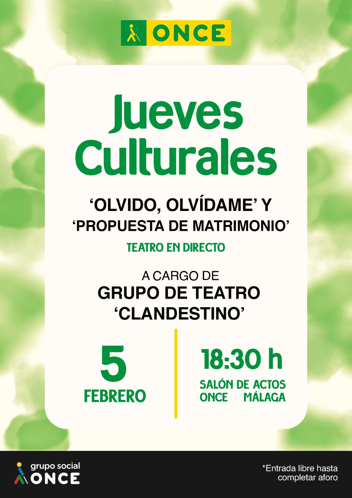 Los Jueves Culturales de la ONCE vuelven, esta vez por partida doble, al teatro con el grupo 'Clandestino', que presentará dos de sus obras: 'Olvido, Olvídame' y 'Propuestas de Matrimonio'. Será como siempre en el salón de actos de la ONCE de Málaga, en calle Cuarteles, 8, a partir de las 18:30. La entrada es libre hasta completar aforo.