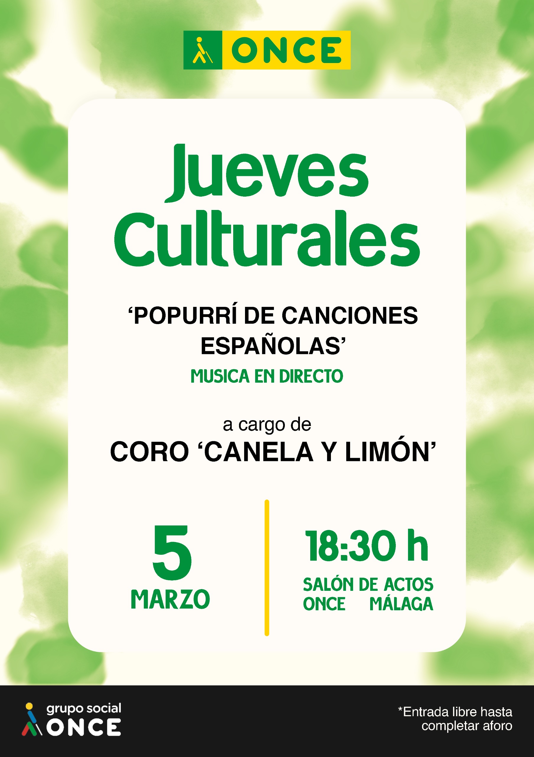 El coro 'Canela y limón' llega a los Jueves culturales para deleitar al público de la ONCE de Málaga con música en directo. Como siempre, a partir de las 18:30 en nuestra sede de Calle Cuarteles, 8. Entrada libre hasta completar aforo