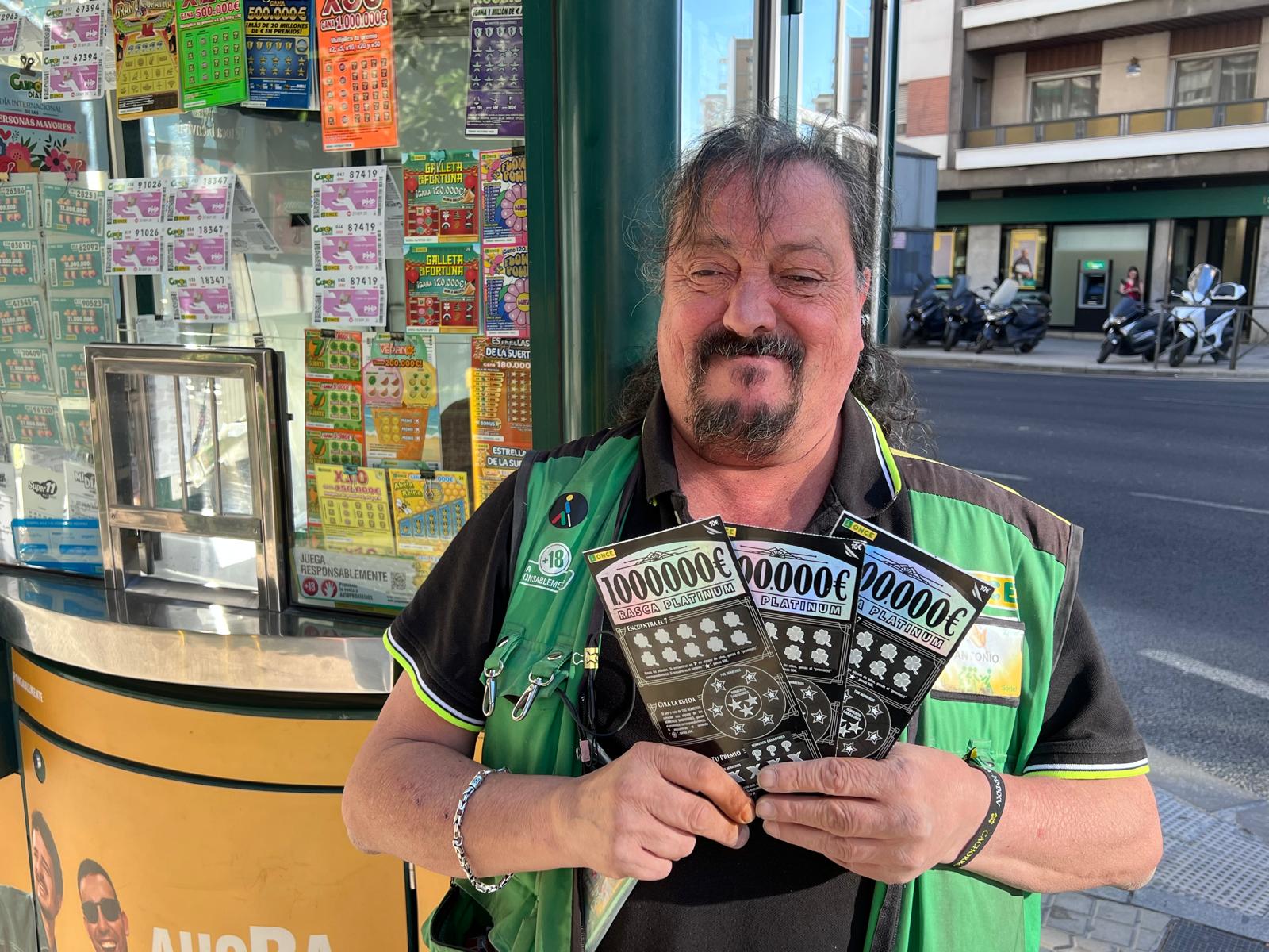 Antonio Velázquez Carmona, afiliado a la ONCE por su discapacidad visual grave y vendedor desde 2008, vendió el jueves 18 de septiembre un Rasca Platinum de la ONCE agraciado con su mayor premio, un millón de euros, en el popular barrio de Los Remedios de Sevilla.